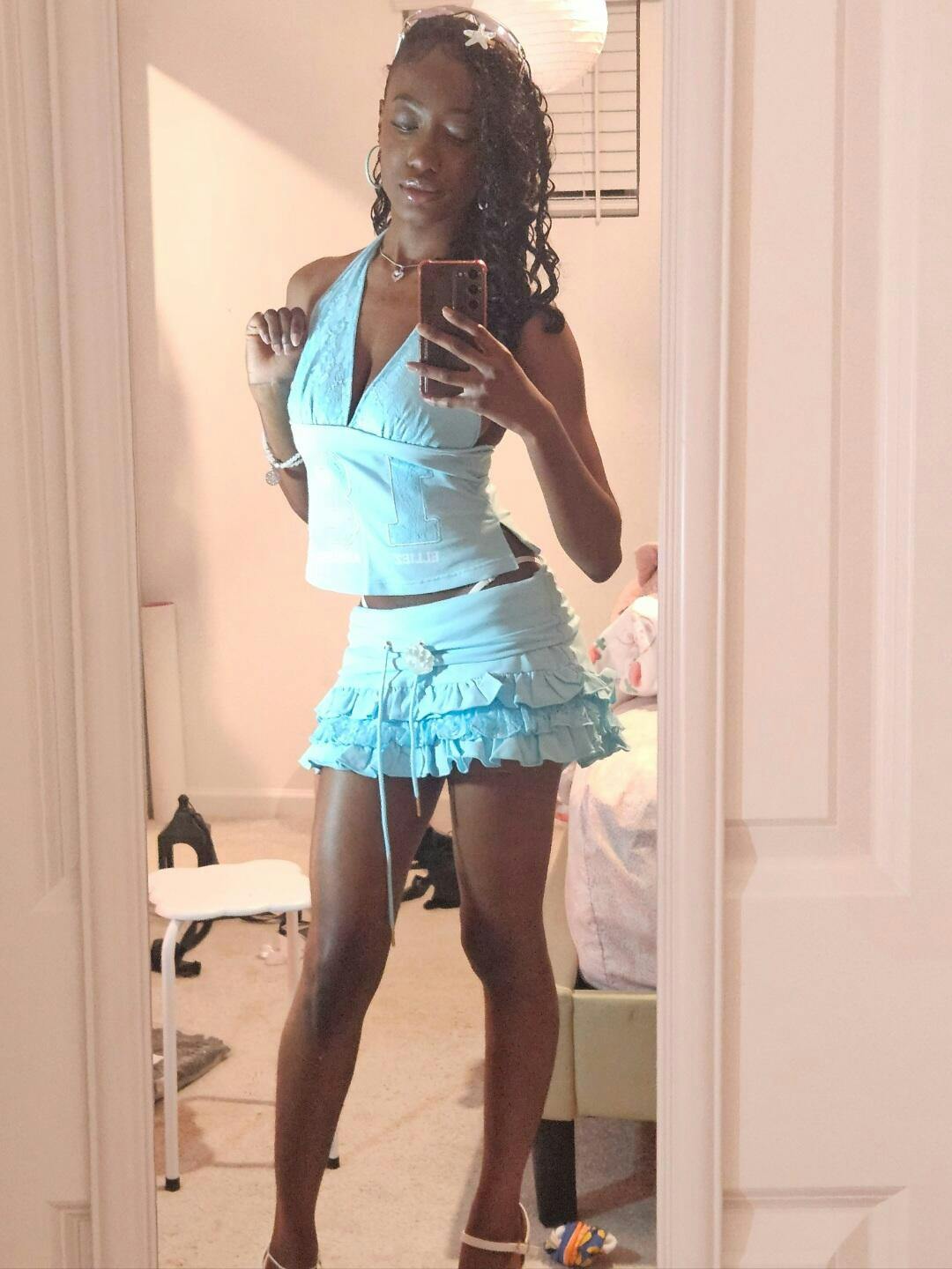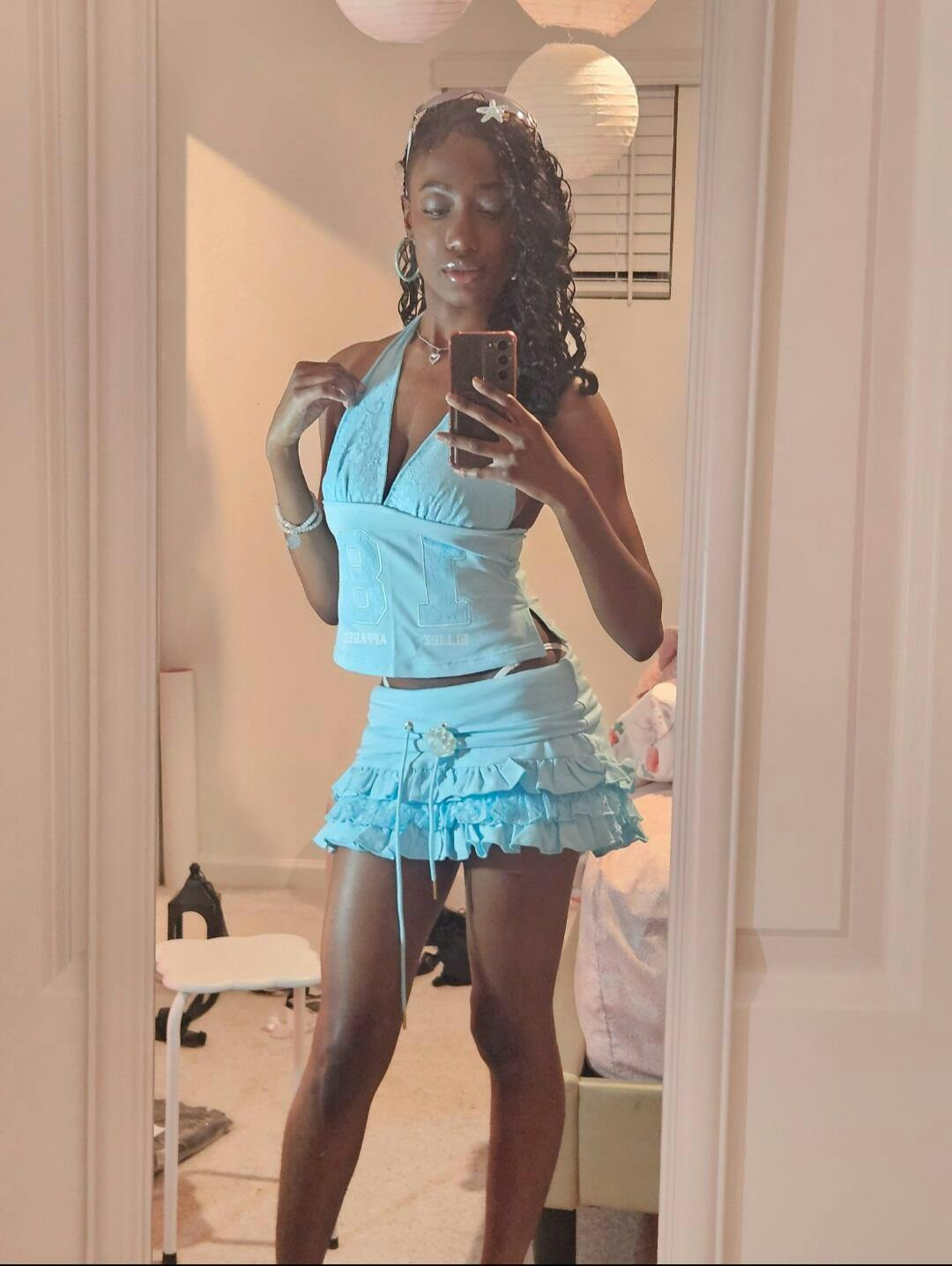 Cassey Absolutely in love with this laced top, the design ate downnn; just like the skirt it's so cute, comfortable, and makes me feel confident! I love how the set makes me feel so cutesy, the lace is definitely my favorite part but also the logo with the 18!! Love it down. The skirt is too cute! It's so comfortable and is a huge confidence booster. I love the ruffles and the color; my favorite thing is how pretty I feel in this skirt🩵! 😻